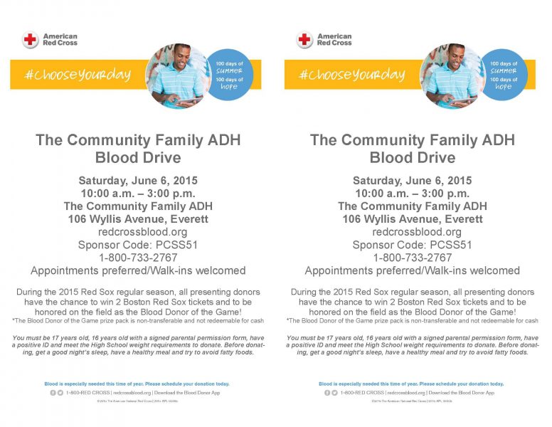 The Community Family is hosting a blood drive at its Everett center on Saturday, June 6 from 10:00 a.m. – 3:00 p.m. We are hoping to have at least 20 people sign up in advance. You can do so at the www.redcrossblood.org website. The Sponsor Code you will need for our event is PCSS51. Come join…