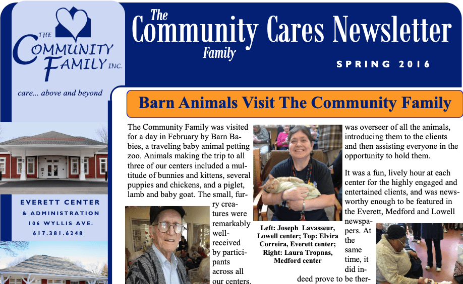 The Community Family has entered into a partnership with D’Youville Life & Wellness Community of Lowell by consolidating their adult day health center programs. The consolidation will consist of D’Youville’s current adult day health clients being given the preferred option of transitioning to TCF’s Lowell center by March 31, 2017. In return, all of TCF’s…